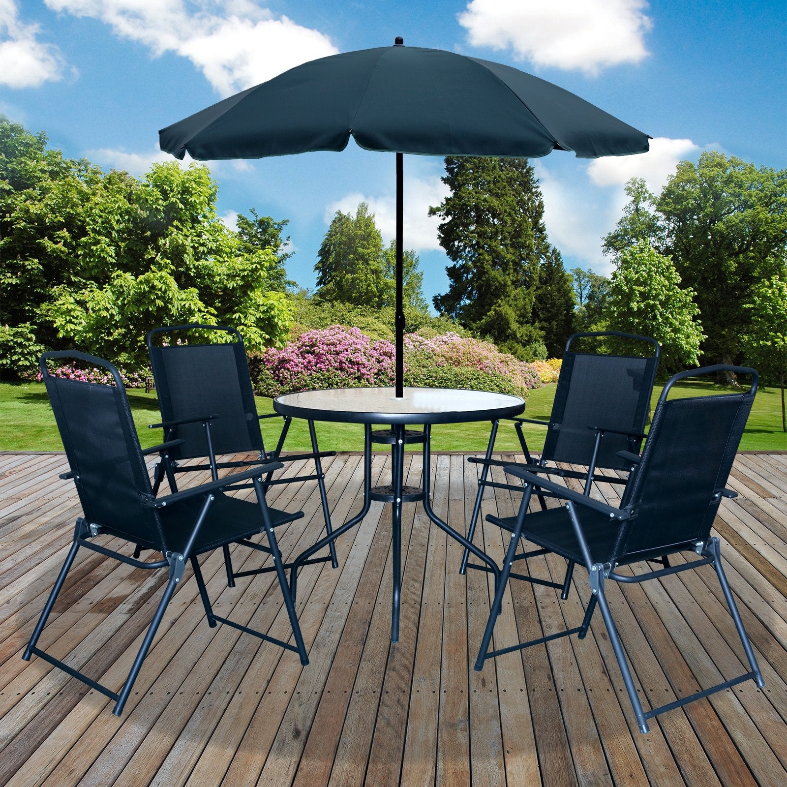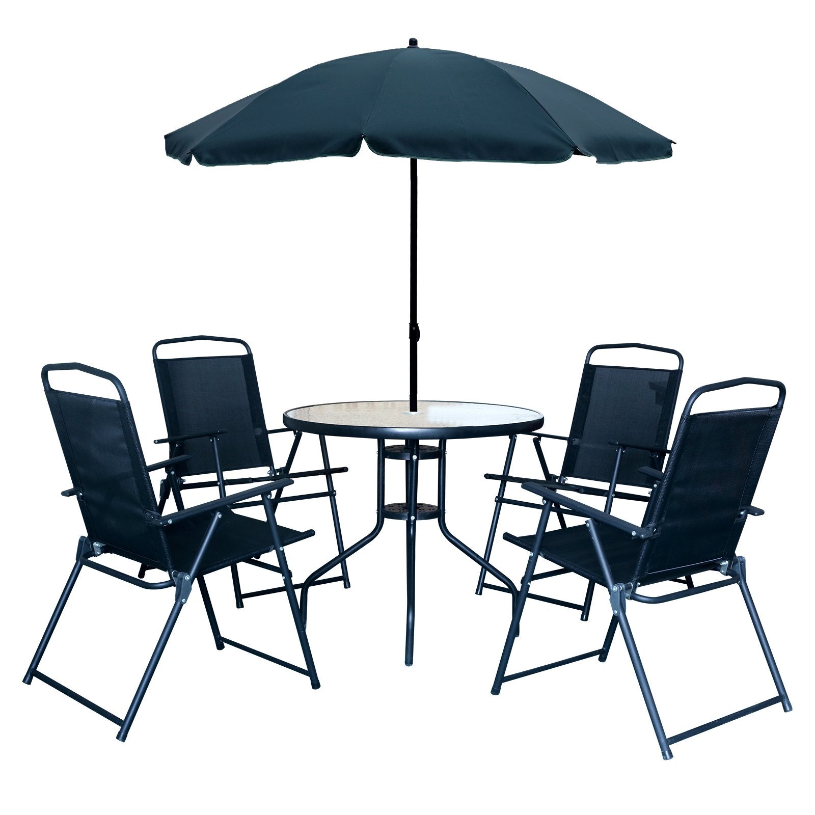 This 6 piece garden furniture set from marko™ outdoor has everything you need - 4 folding chairs, a large tempered glass topped table with a sturdy metal frame, and a tilting sunshade umbrella.